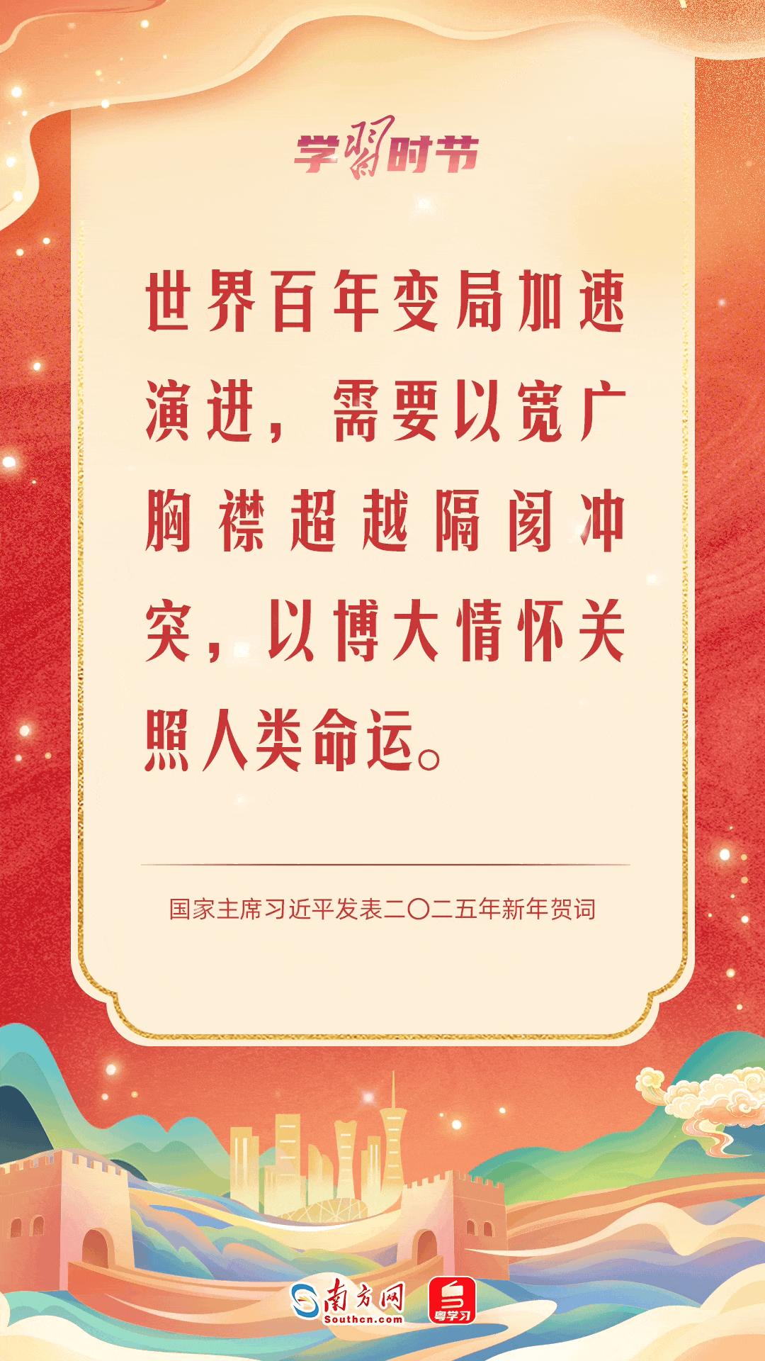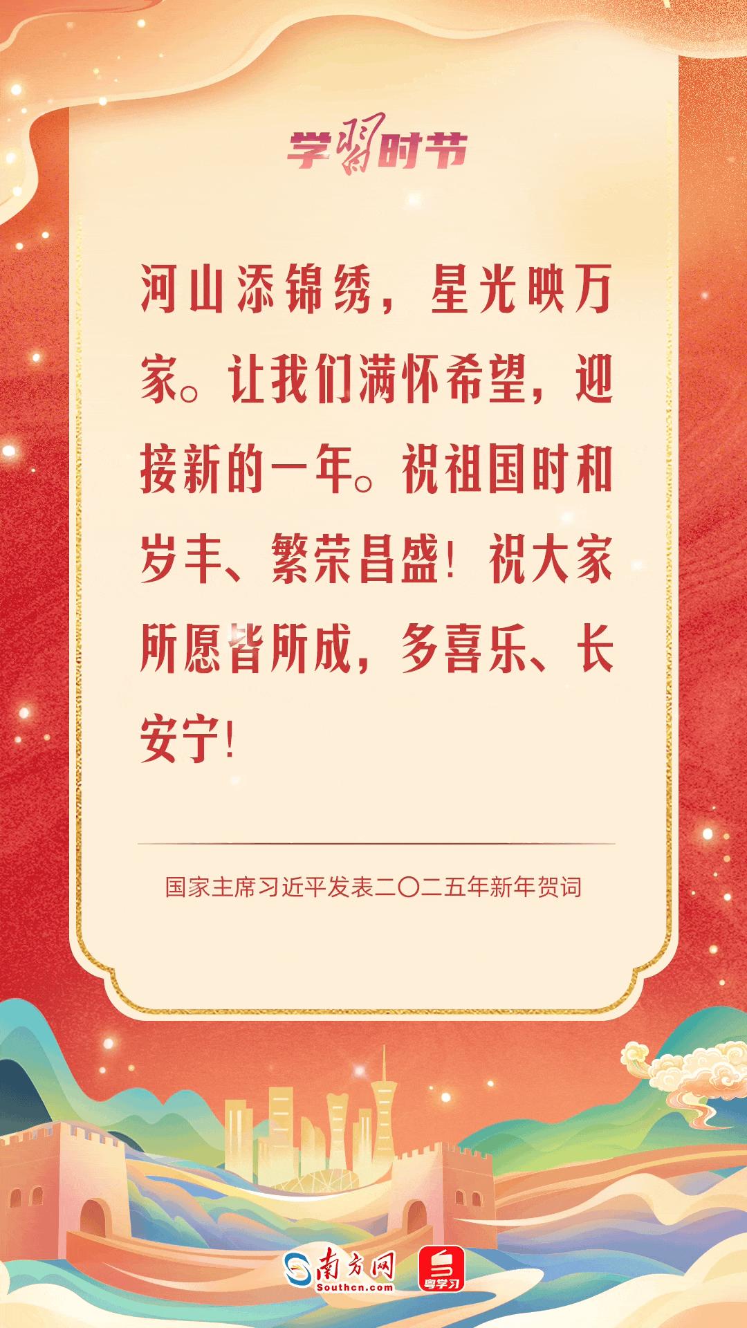 2024年岁末之夜,国家主席习近平在北京发表二〇二五年新年贺词。贺词的字里行间,流淌的是对人民的深厚情怀,是对国家繁荣昌盛的坚定信念,是对世界和平发展的美好愿景。让我们在习近平主席的新年贺词中共汲奋进之力,共绘前行之图。