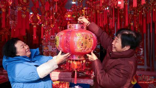 1月2日,市民正在挑选新年饰品。随着农历蛇年的脚步临近,柘城县年货市场装扮一新,大红灯笼、春联、年画和中国结等春节饰物吸引众多市民前来选购。 张超 摄