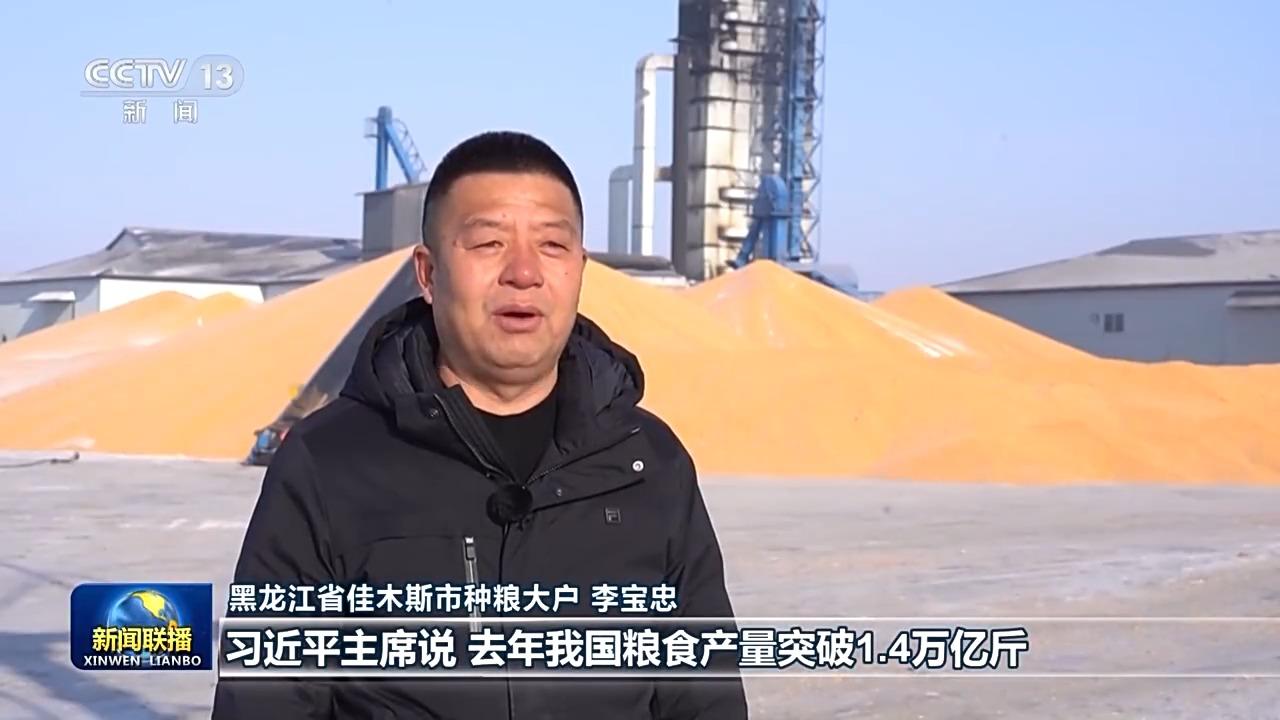 黑龙江省佳木斯市种粮大户 李宝忠:习近平主席说,去年我国粮食产量突破1.4万亿斤,中国碗装了更多中国粮。听到这话我心里特别自豪。今年春耕之前,我们要更新购置大型高端智能的玉米收割机,我要和乡亲们一起加油干,在农业现代化的道路上扎实走好每一步,用我们的双手把中国饭碗端得更牢。
