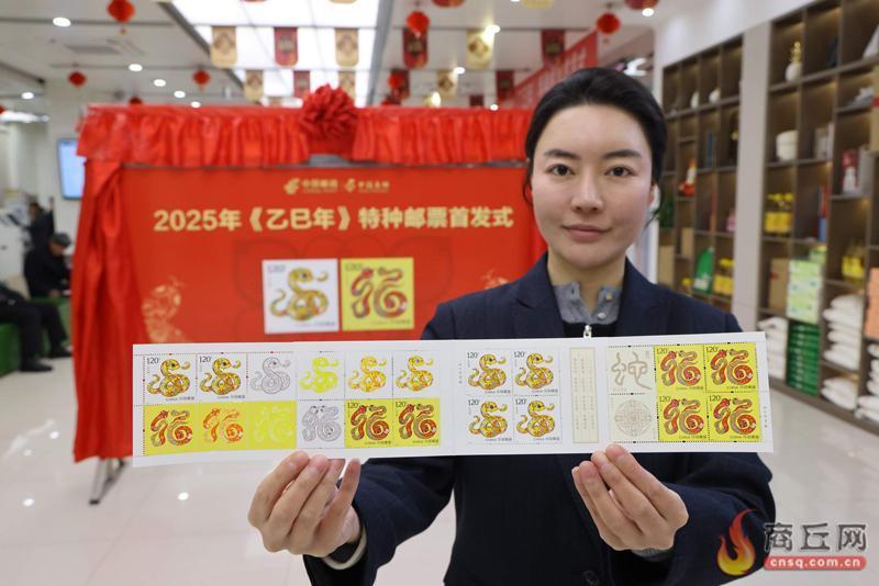 1月5日上午,商丘邮政市区分公司在府前支行集邮营业厅举行《乙巳年》特种邮票首发式。《乙巳年》特种邮票以敦煌壁画和传统民俗为灵感来源,将蛇的形象与吉祥寓意巧妙结合。邮票一套两枚,图案名称分别为“蛇呈丰稔”“福纳百祥”。全套邮票面值为2.40元。记者 邢栋 摄