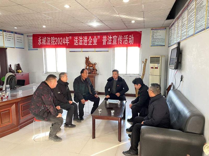 连日来,永城市人民法院开展“送法进企业”活动,护航促发展。图为高庄法庭庭长梁宁带领干警到河南天邦易佳建材有限公司开展送法进企业普法宣传活动。 本报融媒体记者 梁晓晨 通讯员 曹萍萍 摄