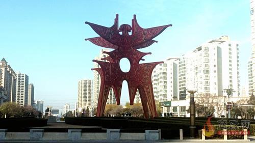 “商”字广场的中心是“商”字雕塑。“商”字雕塑高21米、横向跨度22米,屹立在2500平方米的环岛上,建成于1997年6月29日。