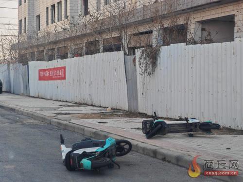 1月20日,在红旗路与健康路交叉口,几辆共享电动车被推倒,影响市民出行体验。本报融媒体记者 邢 栋 摄