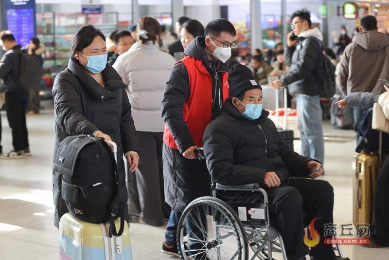近日,商丘高铁站,商丘火车站青年志愿者帮助腿脚不方便的旅客出站。为助力旅客便捷出行,商丘火车站为有特殊需求旅客提供接站送站、购票帮助、绿色通道等服务,温暖旅客春运回家路。