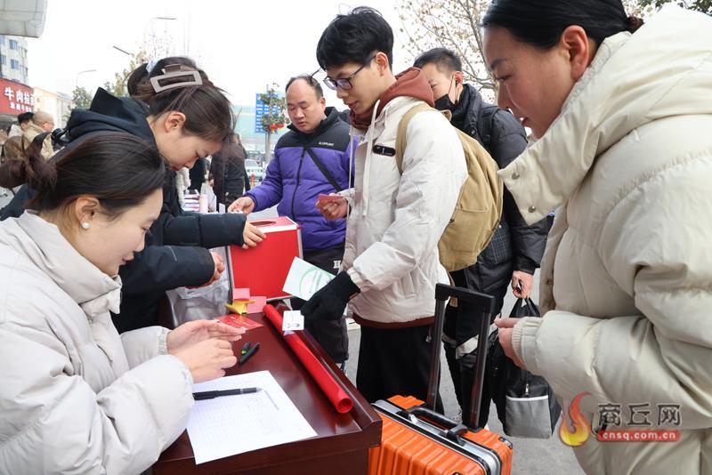 1月22日,商丘邮政分公司在商丘中心汽车站开展“万张车票温暖归途”活动,拉开了为全市春节期间务工群体平安回家服务保障工作的序章。据了解,本次“万张车票温暖归途”活动,1月22日至1月24日在商丘中心汽车站设立免费乘车点,每天10:00、15:00两个时间点,面向永城、夏邑、虞城、柘城、宁陵、睢县、民权7个(县)市各发送1辆车,合计每天14个班次。全市所有外出务工返乡人员,手持本人返乡火车票或车票电子截图均可免费乘车。