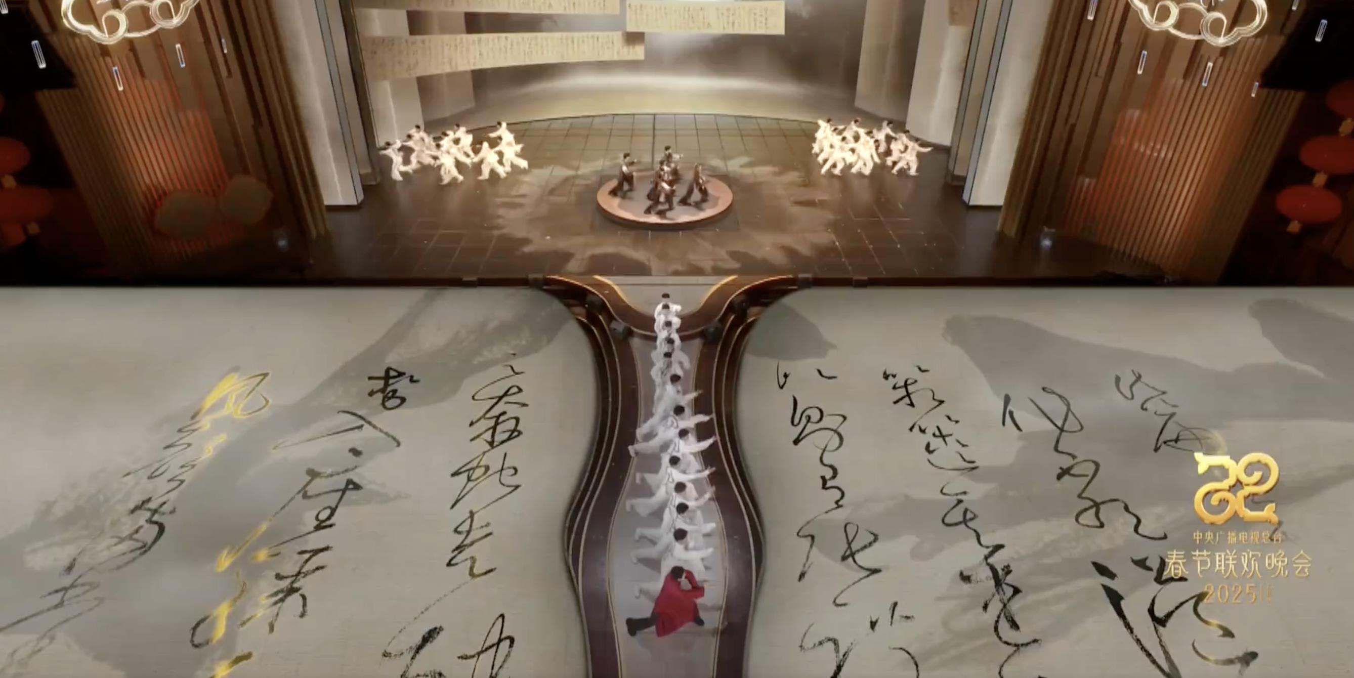在2025央视春晚,甄子丹和塔沟武校的76名学员共同呈现了《笔走龙蛇》,让全国观众彻底欣赏到一场行云流水的武术和书法相结合的创意表演。《笔走龙蛇》的节目创意来源与怀素的《自叙帖》,塔沟武校的功夫小子们将书法艺术融于武术的一招一式,舞台为“砚”,上演太极武术的阴阳之道与书法笔墨的黑白之韵。