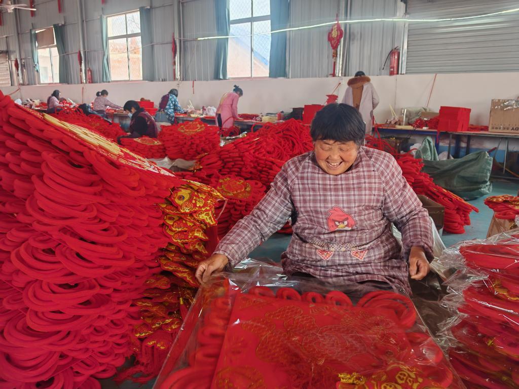 新华社郑州2月8日电(记者吴刚)春节假期刚过,河南省邓州市陶营镇王良村的工厂车间里已是一派繁忙景象。62岁的村民胡选霞手指翻飞,一根红绳在她掌心穿梭,不到3分钟便编出一枚精巧的中国结。这样的手工结,她每天能完成200多个,月收入超3500元,“比俺种几亩地挣得多哩!”