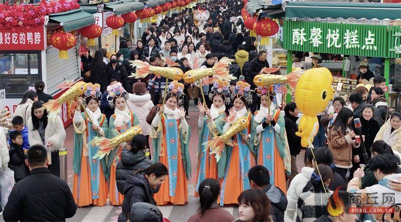 近日,向阳路步行街人流如织,汉服巡游活动现场火热,身着华丽汉服的巡游者们手持鱼灯,为即将到来的元宵佳节添一抹古韵,尽显传统文化魅力。记者 崔 坤 摄