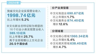 本报讯(记者胡舒彤)2月14日,记者从省统计局获悉,2024年我省规模以上文化及相关产业企业(以下简称“文化企业”)实现营业收入1998.74亿元,比上年增长5.2%。其中,文化新业态特征较为明显的16个行业小类实现营业收入389.13亿元,比上年增长25.7%,高于全部规模以上文化企业20.5个百分点。