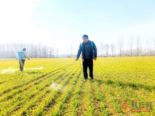 2月18日,民权县野岗镇胡庄村,村民正在给小麦喷洒营养液。当地农民抢抓农时,加强田间管护作业,为夏粮丰收打好基础。 本报融媒体记者 闫鹏亮 摄