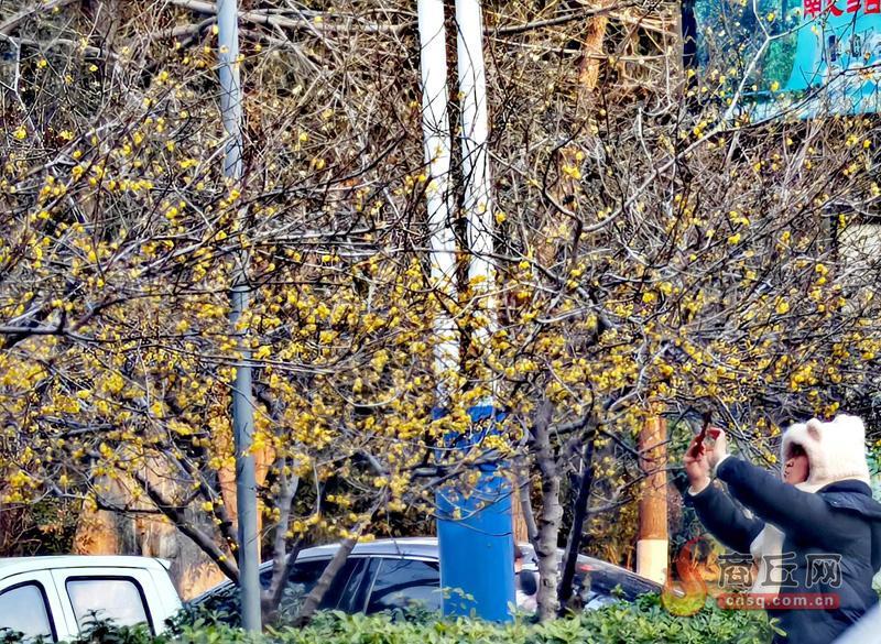 2月19日,中州路旁,一市民正在使用手机拍摄蜡梅。我市各公园及道路两侧绿化带内栽种的蜡梅进入盛花期,吸引了众多市民前来观赏。蜡梅花期可持续至3月中下旬。