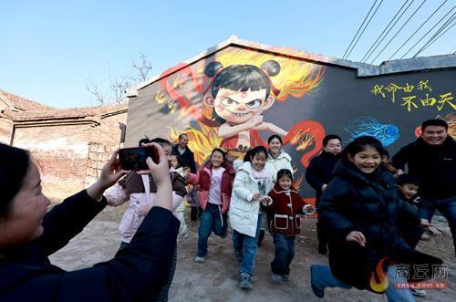 2月23日,游客正在睢阳区闫集镇吴营村哪吒主题墙绘作品前参观拍照。近日,商丘青年画家吴承言在家乡创作的多幅哪吒主题墙绘迅速“出圈”,吸引了大批游客前来打卡。本报融媒体记者 魏文慧 摄