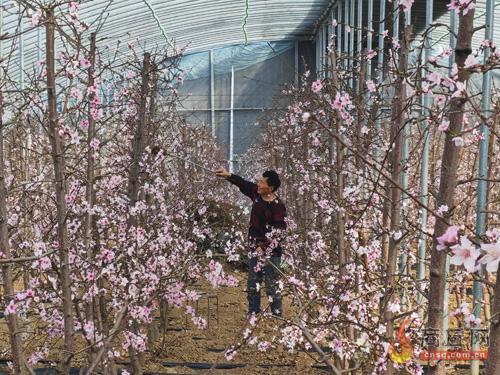 2月24日,市城乡一体化示范区民安街道办事处侯楼集村的油桃种植大棚内,桃花竞相绽放,果农正在进行人工授粉,以增加坐果率,确保丰产增收。本报融媒体记者 邢 栋 摄