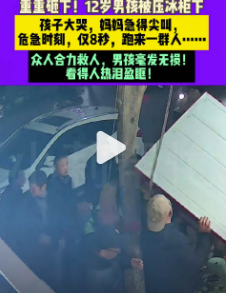 孩子获救母亲感慨:还是好人多!2月27日,河南驻马店,街边小店冰柜突然倒下,重重砸下!12岁男孩被压妈妈急得尖叫,危急时刻,仅8秒,跑来一群人……众人合力救人, 看得人热泪盈眶!孩子母亲:认识的我们都当面感谢了,想借网络谢谢陌生人,有外卖小哥,有吃饭的顾客,那么快他们都没有犹豫,最后又帮忙收拾现场...
