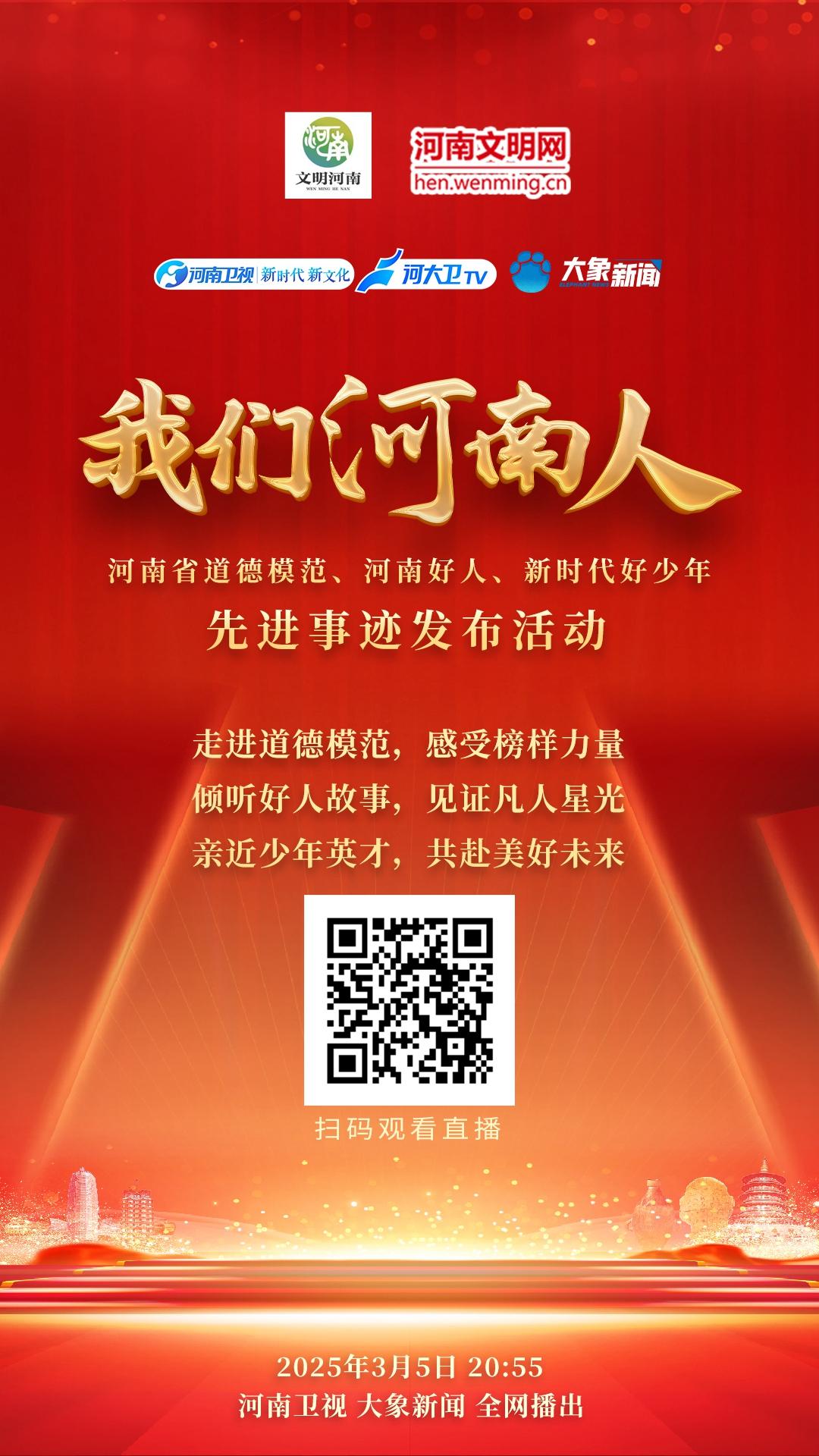 今晚(3月5日)20点55分,《“我们河南人”——河南省道德模范、河南好人、新时代好少年先进事迹发布活动》将在河南卫视正式开播。让我们一同走进道德模范,感受榜样力量;倾听好人故事,见证凡人星光;亲近少年英才,共赴美好未来。