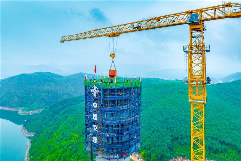 渑淅高速丹江小三峡特大桥北岸主塔成功封顶。 本报资料图片 记者 聂冬晗 摄