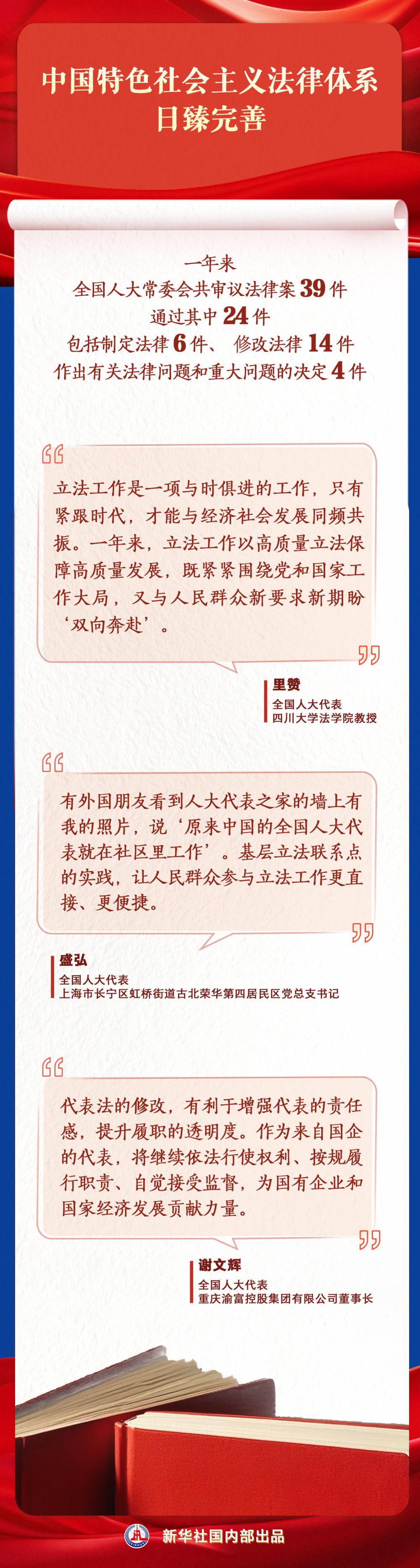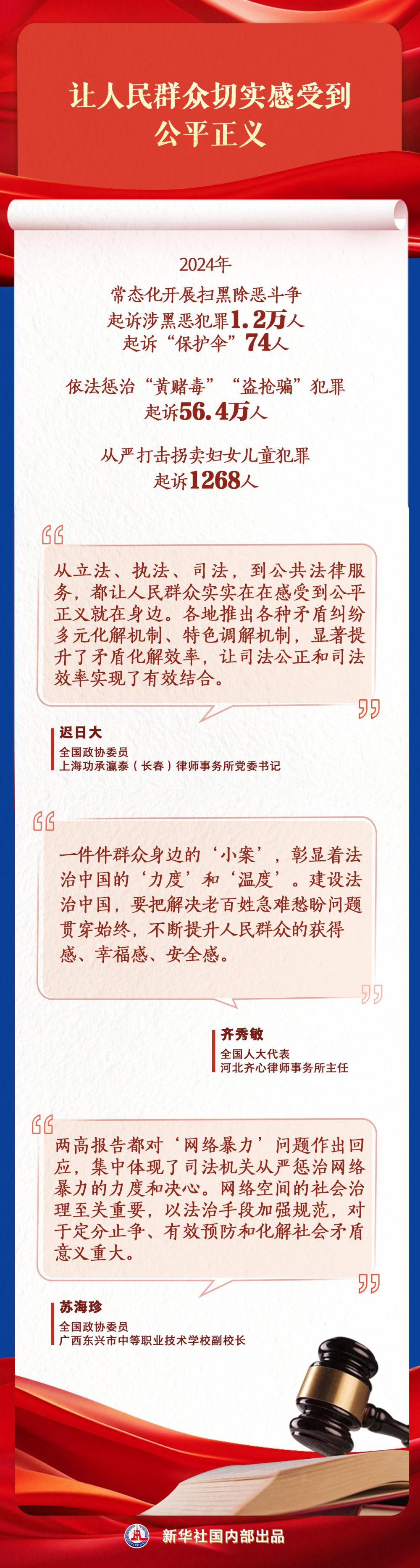 新征程上 在以习近平同志为核心的党中央坚强领导下 深入贯彻落实习近平法治思想 坚持全面依法治国,推进法治中国建设,用法治保障人民安居乐业 中国特色社会主义法治道路越走越宽广 政府工作报告对加强法治政府建设作出一系列具体部署 全国人大常委会工作报告展现重点领域、新兴领域、涉外领域立法“成绩单” 两高报告彰显维护公平正义的法治担当 透过全国两会这扇窗 可见法治中国建设的最新进展 党的二十届三中全会审议通过的 《中共中央关于进一步全面深化改革、推进中国式现代化的决定》 明确提出 在法治轨道上深化改革、推进中国式现代化 一年来 在进一步全面深化改革进程中 法治固根本、稳预期、利长远的保障作用得以充分发挥 公平正义 是人民所求、民心所向 民生福祉 是法治中国建设始终不变的关键词 法治兴则国兴,法治强则国强 向着第二个百年奋斗目标昂首奋进 法治中国的足音铿锵有力 法治精神、法治理念、法治文化在全体人民心中深深扎根 必将为以中国式现代化全面推进强国建设、民族复兴伟业凝聚起磅礴伟力 记者:孙少龙、齐琪、徐壮 设计:潘一景 新华社国内部出品
