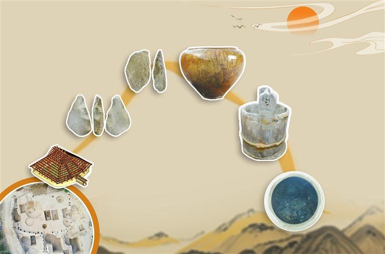 “铸鼎原古国”遗址中的“大别墅” 阿舍利石器组合 高约1.2米的大瓷瓮 保存完好的宋元时期的水桶 古人的“存钱罐”,一处窖藏铜币 制图/首席编辑 杨芳芳