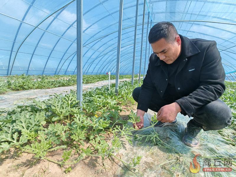 3月16日,虞城县大侯镇张集村的西瓜种植棚内,瓜农在查看西瓜苗长势。随着气温逐渐回升,张集村的西瓜种植棚内一片繁忙景象,瓜农正抢抓农时,悉心管护西瓜苗,为今年的西瓜丰收打下坚实基础。记者 邢 栋 摄