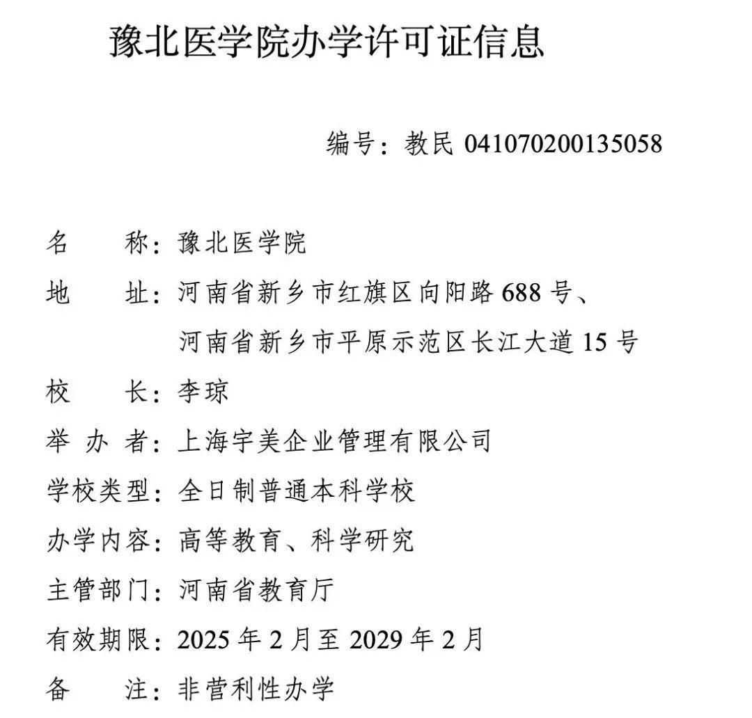 一、豫北医学院为民办普通本科学校,由你省领导和管理。