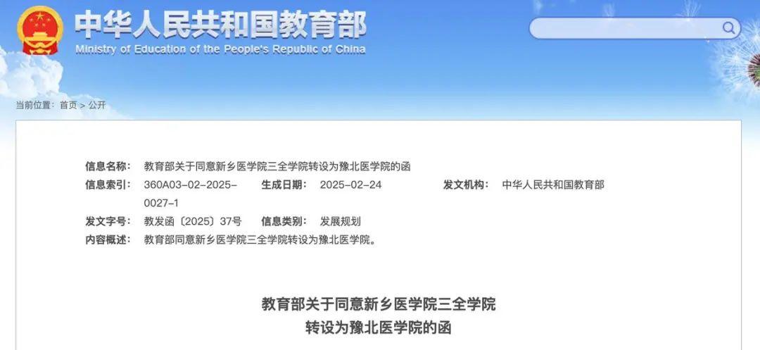 《河南省人民政府关于新乡医学院三全学院转设为豫北医学院的函》(豫政函〔2024〕24号)收悉。根据《中华人民共和国高等教育法》《中华人民共和国民办教育促进法》《中华人民共和国民办教育促进法实施条例》《普通高等学校设置暂行条例》等有关规定以及第八届全国高等学校设置评议委员会评议结果,经教育部党组会议研究决定,同意新乡医学院三全学院转设为豫北医学院,学校标识码4141013505。同时撤销新乡医学院三全学院的建制,并根据现有在校生届数设立过渡期。现将有关事项函告如下: