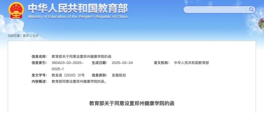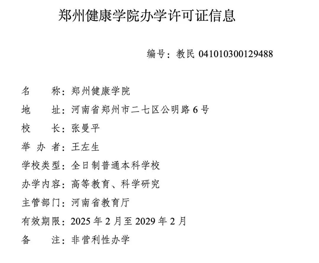 《河南省人民政府关于以郑州澍青医学高等专科学校为基础设立郑州卫生健康学院的函》(豫政函〔2023〕127号)和《河南省教育厅关于将设立郑州卫生健康学院校名变更为郑州健康学院的请示》(豫教发规〔2025〕14号)收悉。根据《中华人民共和国高等教育法》《中华人民共和国民办教育促进法》《中华人民共和国民办教育促进法实施条例》《普通高等学校设置暂行条例》有关规定以及第八届全国高等学校设置评议委员会评议结果,经教育部党组会议研究决定,同意以郑州澍青医学高等专科学校为基础设立郑州健康学院,学校标识码4141012948。同时撤销郑州澍青医学高等专科学校的建制。现将有关事项函告如下。