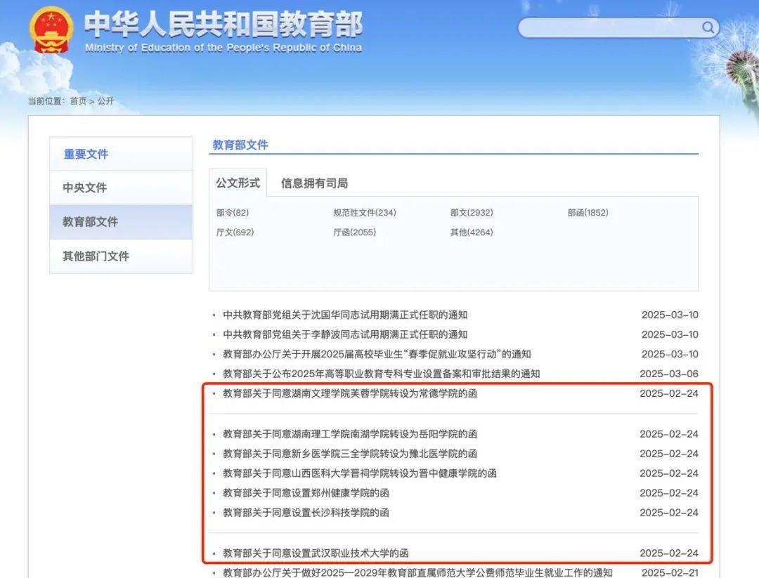 3月17日,教育部官网发布了“教育部关于同意设置武汉职业技术大学的函”“教育部关于同意设置长沙科技学院的函”等7个通知,同意湖南文理学院芙蓉学院转设为常德学院,湖南理工学院南湖学院转设为岳阳学院,新乡医学院三全学院转设为豫北医学院,山西医科大学晋祠学院转设为晋中健康学院,设置郑州健康学院,设置长沙科技学院,设置武汉职业技术大学。