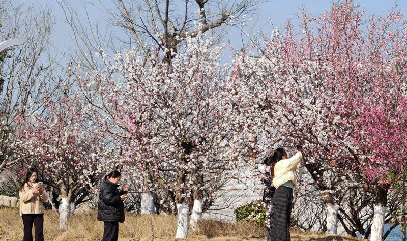 3月16日,游客在睢县凤栖湖景区赏花和拍照留念。近日,随着气温的回升,该景区的杏花迎春绽放,吸引众多市民游客前来赏花拍照。