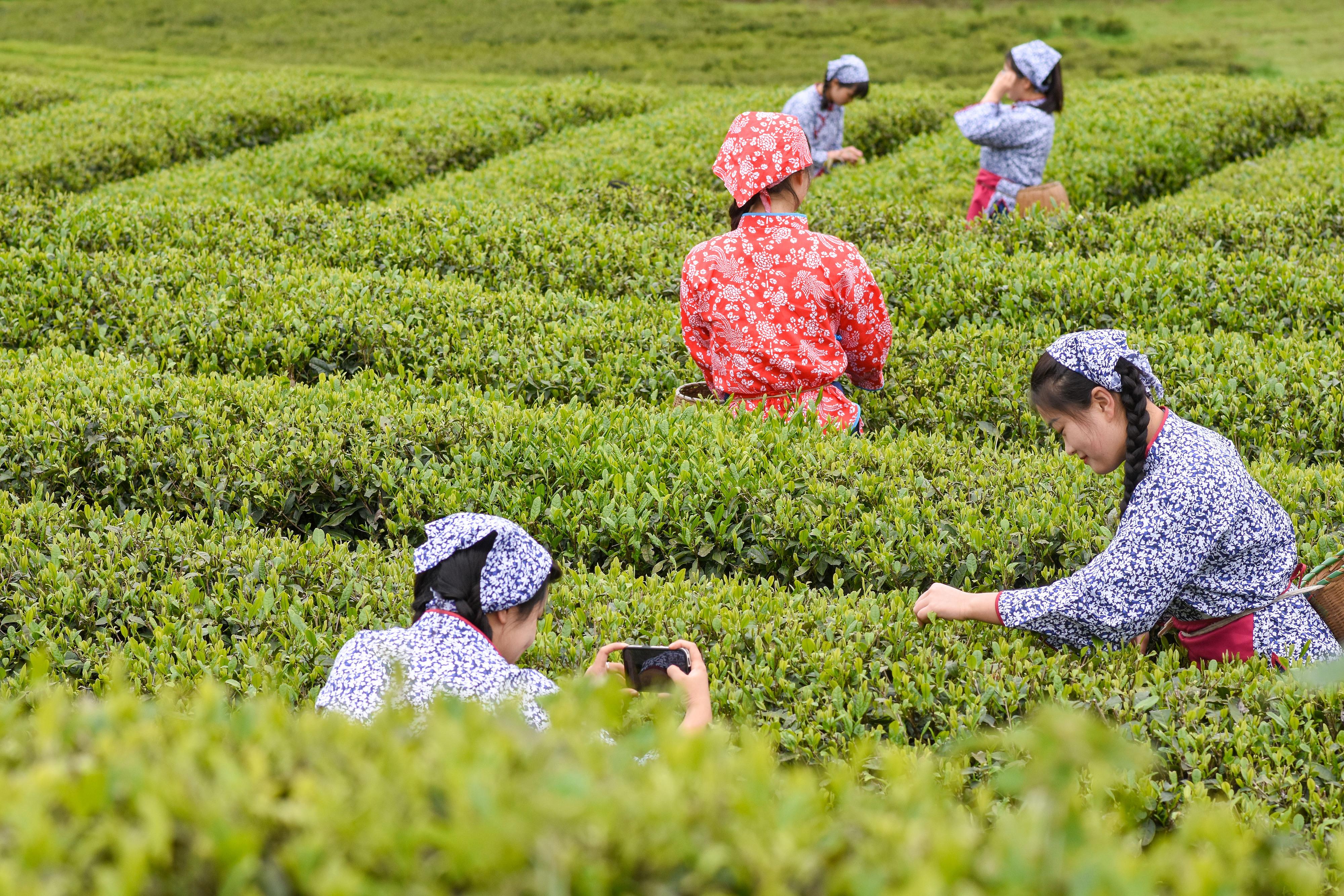 2023年4月6日,游客在贵州省铜仁市江口县怒溪镇骆象村生态茶园体验采茶乐趣。