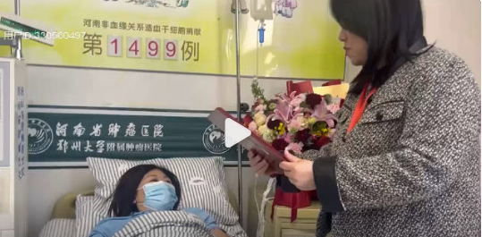 3月20日,河南省肿瘤医院,来自商丘市宁陵县疾控中心医护人员张淑娟,成功完成249毫升造血干细胞混悬液的采集,为上海一名白血病患者送去生命的种子,相关领导为她送上鲜花和荣誉证书,并现场宣读,釆集完成后,相关人员与张淑娟女士合影留念。商丘市红十字造血干细胞志愿服务队队长朱利刚介绍说,这是河南省第1499例、商丘市56例、宁陵县16例造血干细胞捐献者。