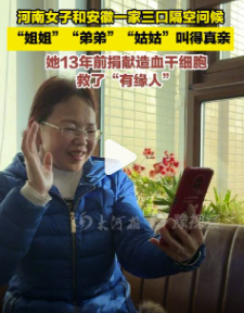 “弟弟、妹妹、宝贝好……”郑州市民肖郑红趁着工作间隙,与安徽的张先生一家三口视频聊天。2012年,当时30岁的张先生被诊断为白血病,需要做造血干细胞移植,捐献的这个人正是河南郑州的红十字志愿者肖郑红。奇妙的“缘分”自此将两家人紧紧相连。 河南女子13年前捐献造血干细胞 如今双方“姐弟”相称亲如一家