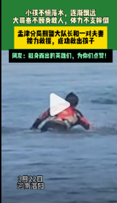 3月22日,河南洛阳。一名小孩不慎落水,逐渐飘远,一名红衣大哥奋不顾身踏浪救人。因体力不支摔倒后,孟津分局刑警大队长和一对夫妻在关键时刻挺身而出,接力救援,成功救出孩子。网友:比死神先到的是仨河南老乡伸出的援手,为英雄们点赞!