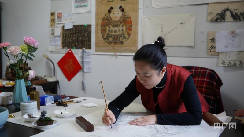 乔兰蓉正在勾绘《一团和气》线稿(央广网记者 王纪民 摄)