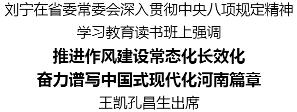 按照省委关于开展深入贯彻中央八项规定精神学习教育工作安排,3月24日至25日,省委常委会用两天时间,采取集中自学和交流研讨相结合的方式,举办深入贯彻中央八项规定精神学习教育读书班。省委书记刘宁主持并讲话,强调要认真学习领会习近平总书记关于加强党的作风建设的重要论述,全面学习贯彻中央八项规定及其实施细则精神,进一步增强政治自觉、思想自觉、行动自觉,推进作风建设常态化长效化,奋力谱写中国式现代化河南篇章。省长王凯、省政协主席孔昌生出席。