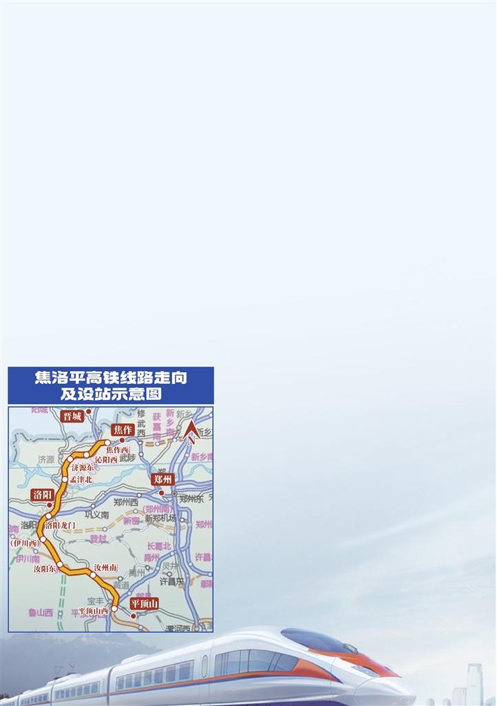 新建焦洛平高铁是国家《中长期铁路网规划》中八纵之一“呼南通道”的组成部分,设计时速350公里,线路起自郑太高铁珏山线路所,向南经焦作市辖沁阳市,济源市,跨黄河后引入郑西高铁洛阳龙门站,经洛阳市伊川、汝阳县,平顶山市辖汝州市,接入郑渝高铁平顶山西站,新建线路长229.2公里,计划总工期4年。
