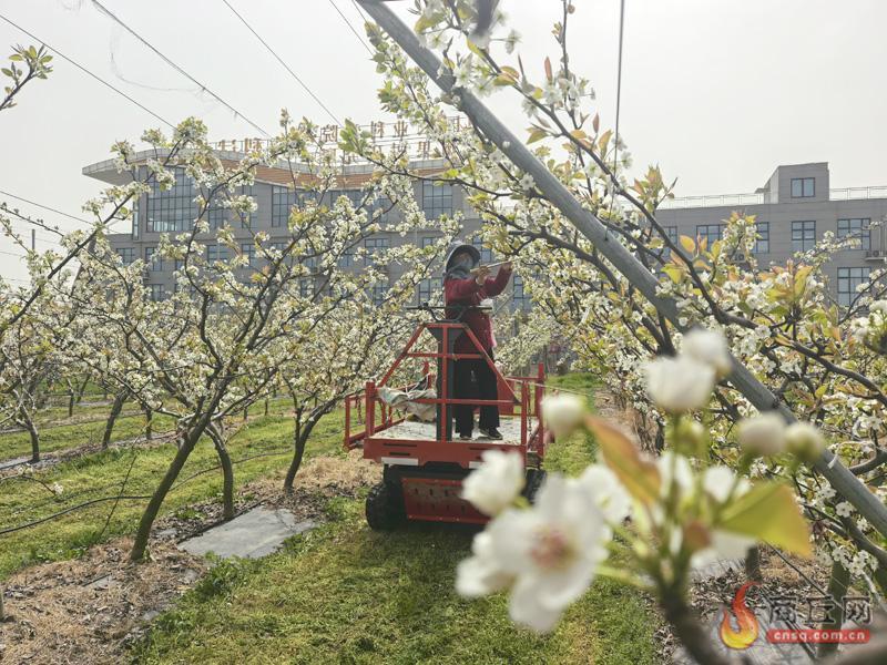 3月28日,果农在宁陵县万亩梨园为梨花授粉。春暖花开,宁陵县22万亩梨园花开正盛,果农趁着晴好天气为梨花授粉,为梨果丰收打下基础。记者 高会鹏 摄