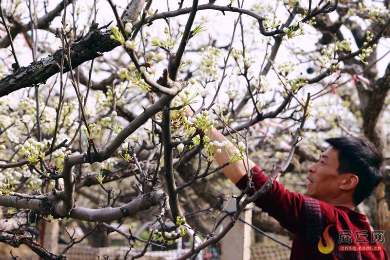 3月28日,梁园区解放街道办事处孙楼村的梨园里,果农在给梨花授粉。随着天气转暖,该村3500余亩梨树进入盛花期,果农抢抓农时为梨花进行人工授粉,为增产增收打好基础。记者 邢 栋 摄