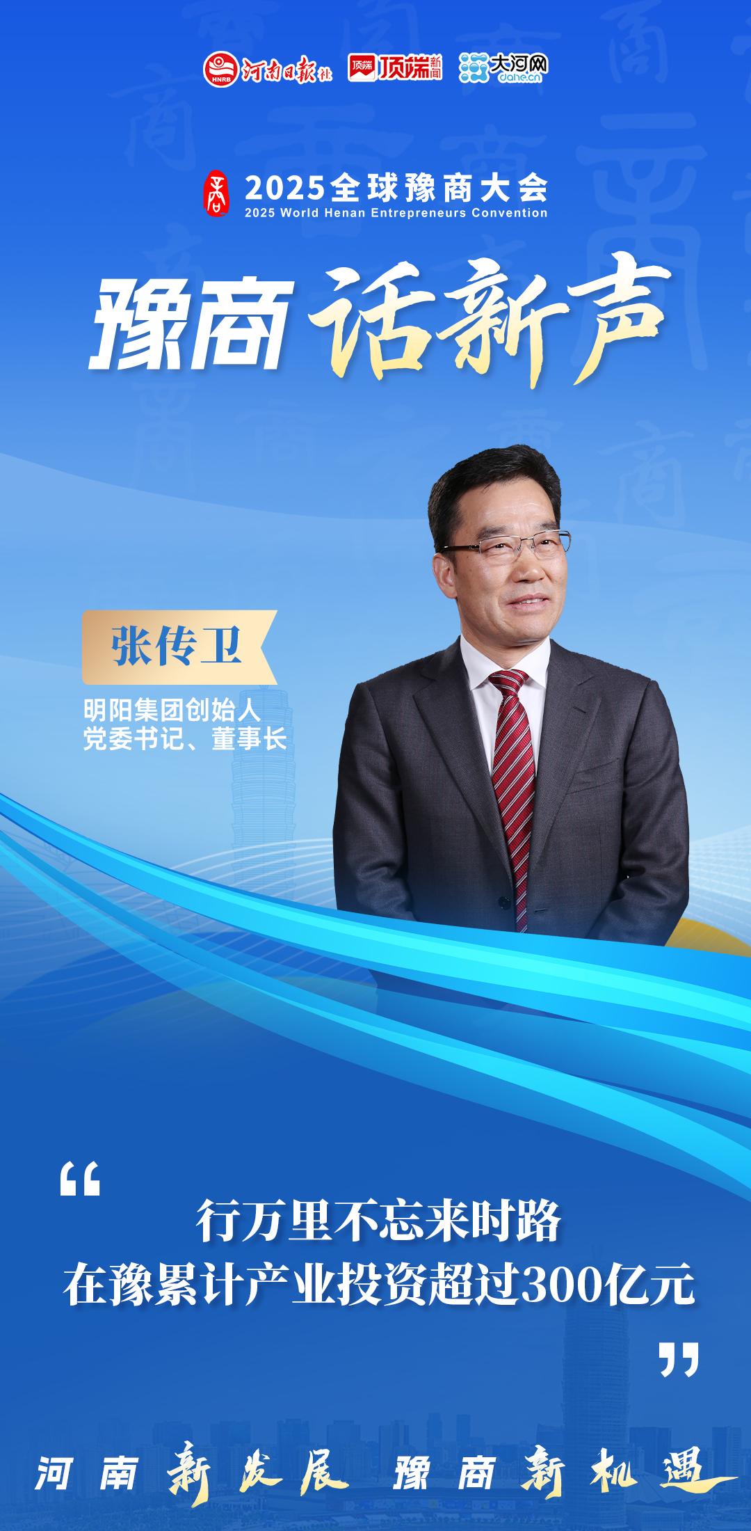 “行万里不忘来时路。作为豫商,一直都有奉献家乡、造福家乡、服务家乡的情怀。”张传卫说。明阳集团在河南打造新能源高端装备产业集群,先后在固始、信阳高新区、潢川以及南阳建设四大产业园区,累计产业投资超过300亿元,着力打造千亿级的新能源装备产业集群,实现带动一批、引进一批、自投一批,构建风、光、储、氢和循环经济的全产业生态链,目前已形成700万装机的风光储氢年出品能力。