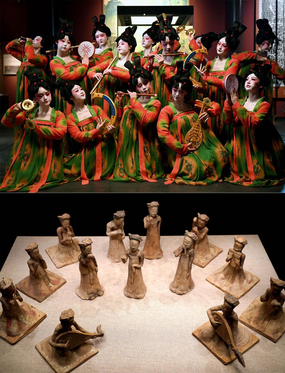 拼版照片:上图为郑州歌舞剧院的演员在录制河南博物院元宵奇妙夜节目(2021年2月20日摄);下图为河南博物院主展馆内展出的展品(2020年9月24日摄)。