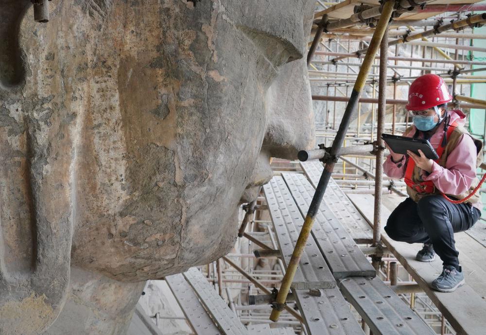 奉先寺位于河南洛阳龙门西山南段,是龙门石窟开凿规模最大、最具代表性的摩崖像龛。2022年7月,龙门石窟奉先寺大型渗漏水治理和危岩体加固保护工程完工。这是工作人员在龙门石窟奉先寺进行勘测作业(2022年4月14日摄)。