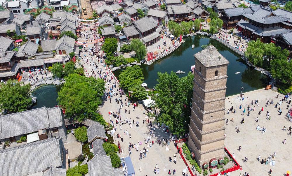 这是位于河南洛阳的洛邑古城景区(2023年5月2日摄,无人机照片)。洛邑古城里精致的布景、各色表演和汉服妆造拍摄吸引大量游客前来。