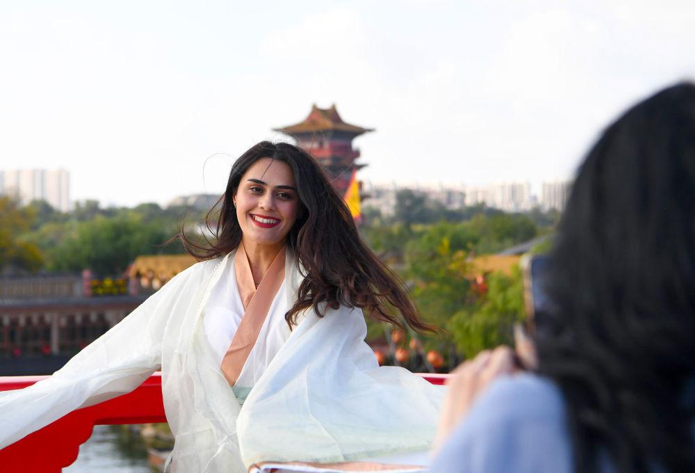 2023年10月24日,游客在洛阳市洛邑古城身着汉服拍照留念。