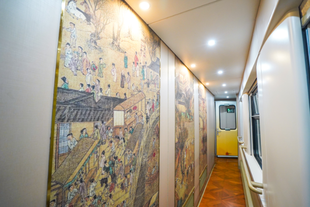 车厢内部设计以“行走的中原文化”为理念,坚持不同类型包房不同文化展示,从河南深厚的文化底蕴中获取灵感,将凸显牡丹之韵、清明上河图之景、陶土色的文化溯源、木纹的禅学雅静、回纹的云气之道等河南地域特色元素有机融入每节车厢的内饰设计,打造移动文化展厅。同时,加大汉字与图像说明相结合的铭牌,更是直观明了,为旅客开启中原文旅新体验。