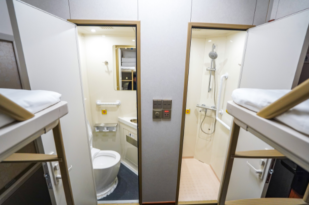 改造升级后的特色旅游列车采用全列动车化设计,按照“酒店式”客房理念,从基础设施、包间布置、卫生设施及特殊保障等四个方面进行针对性舒适化、适老化改造,静音科技让旅客避免相邻包间声音干扰,静享私密空间;上下双层车窗增加室内采光、取消车厢内部隔门、降低通过门槛高度、人性化的铺位大小设计、高回弹乳胶床垫、多光源照明、专属充电口、带荧光的无障碍扶手和采用360度防滑设计的扶手、脚蹬梯、地板等细节设计,降低高龄人群在铁路客车中的通行障碍、操作障碍、信息感知障碍;每个包房都配备有独立卫生间,且采用干湿分离布局,配备恒温马桶、转轴防挤门手和SOS紧急呼叫装置,为老年人提供安全、便利、舒适的居住旅行体验。同时,设置医疗功能区,配备有紧急救助医疗器械及老年用品,随时满足老年人应急、医疗、照顾等需求。