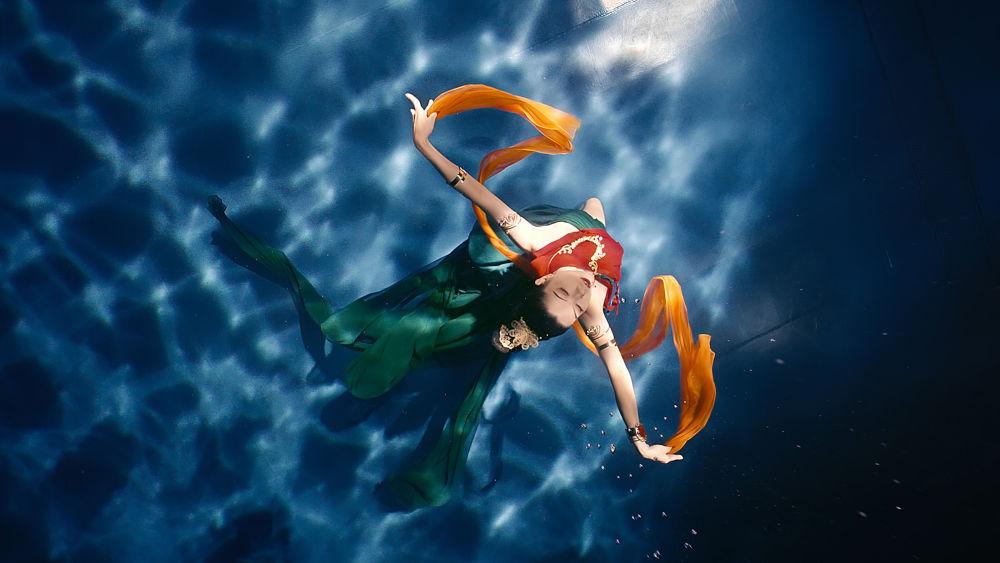 河南卫视2021年端午假期的特别节目《端午奇妙游》中演绎水下飞天的舞蹈《洛神水赋》,精彩再现了曹植名篇《洛神赋》(视频截图,河南广播电视台供图)。