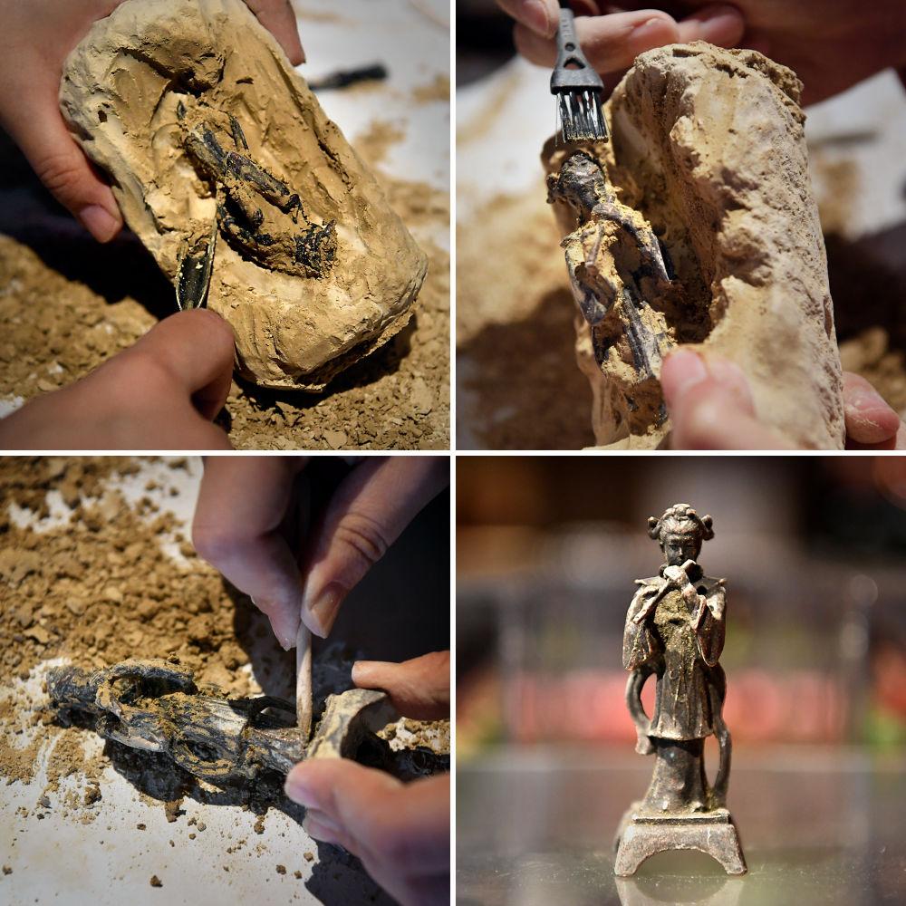 这是河南博物院推出的“考古盲盒”的“挖宝”过程(拼版照片,2022年5月17日摄)。