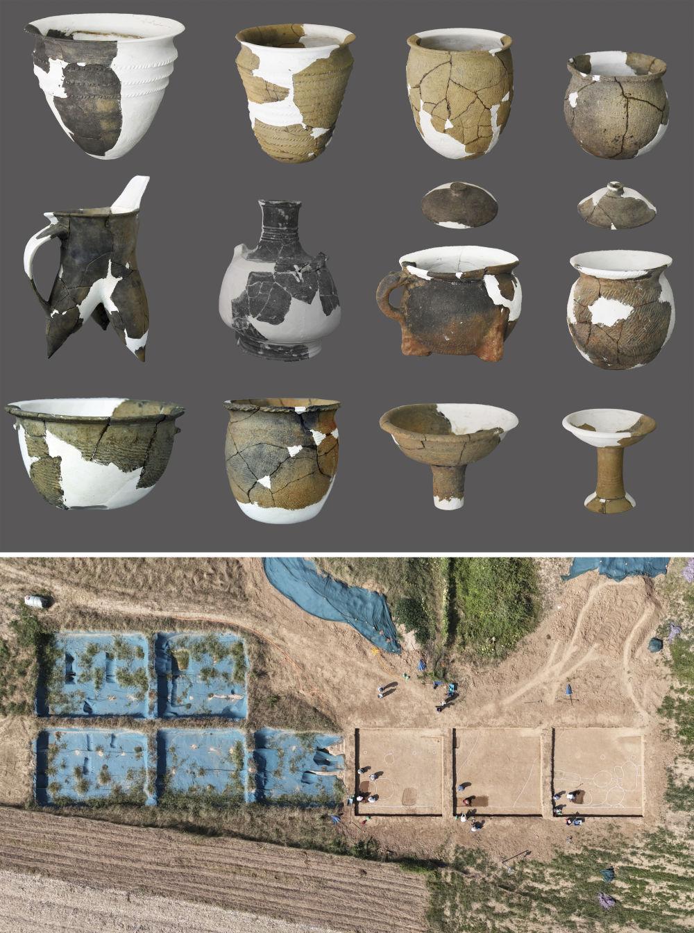 拼版照片:上图为位于河南南阳方城县的八里桥遗址出土的陶器(河南省文物考古研究院供图);下图为八里桥遗址发掘现场(无人机照片,新华社记者袁月明2024年9月11日摄)。八里桥遗址是豫南地区已发现规模最大、等级最高的二里头文化聚落,为探索夏文化地方城邑聚落形态、社会结构提供了新线索。