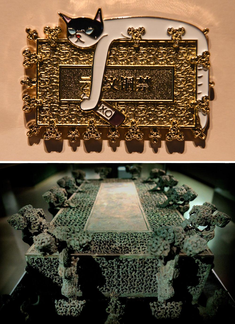 拼版照片:上图为河南博物院推出的“云纹铜禁”冰箱贴(2022年5月17日摄);下图为河南博物院展出的展品“云纹铜禁”(2019年11月18日摄)。