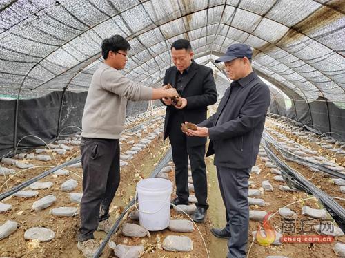 近年来,虞城县李老家乡注重特色产业种植,利用当地能人发展羊肚菌产业,取得初步成效。图为3月30日种植户杨古真(左)向客人介绍羊肚菌生长状况。谢卫勋 摄
