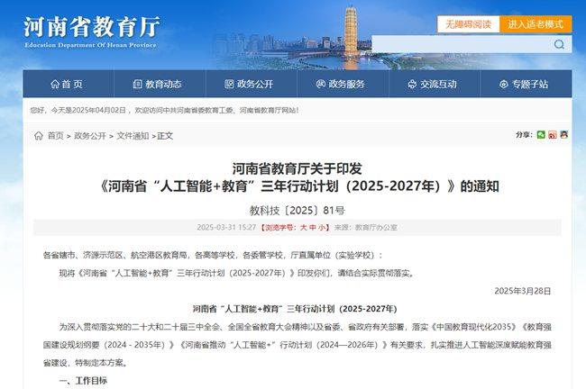 今年的政府工作报告提出,“持续推进‘人工智能+’行动”。近日,河南省教育厅印发《河南省“人工智能+教育”三年行动计划(2025—2027年)》(以下简称《行动计划》),推进人工智能深度赋能教育强省建设。